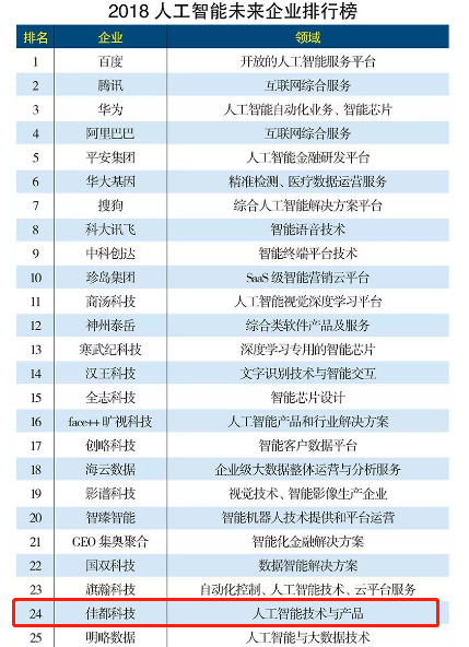 佳都科技在100家人工智能未來企業(yè)中名列第24位