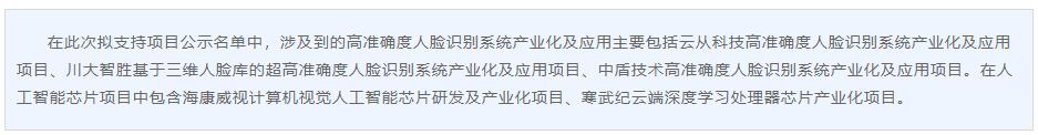 在此次擬支持項(xiàng)目公示名單中,涉及到的高準(zhǔn)確度人臉識(shí)別系統(tǒng)產(chǎn)業(yè)化及應(yīng)用主要包括云從科技高準(zhǔn)確度人臉識(shí)別系統(tǒng)產(chǎn)業(yè)化及應(yīng)用項(xiàng)目、川大智勝基于三維人臉庫(kù)的超高準(zhǔn)確度人臉識(shí)別系統(tǒng)產(chǎn)業(yè)化及應(yīng)用項(xiàng)目、中盾技術(shù)高準(zhǔn)確度人臉識(shí)別系統(tǒng)產(chǎn)業(yè)化及應(yīng)用項(xiàng)目。在人工智能芯片項(xiàng)目中包含海康威視計(jì)算機(jī)視覺人工智能芯片研發(fā)及產(chǎn)業(yè)化項(xiàng)目、寒武紀(jì)云端深度學(xué)習(xí)處理器芯片產(chǎn)業(yè)化項(xiàng)目。
