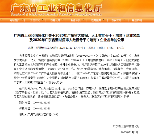 11月23日,廣東省工業和信息化廳發布了關于2020年廣東省大數據、人工智能骨干(培育)企業名單的公示。佳都科技憑借著突出的人工智能創新能力和產業帶動作用,入選2020年廣東省人工智能骨干企業名單,同時,佳都科技控股子公司方緯科技、參股公司云從科技入選該名單,佳都科技全資子公司新科佳都入選2020年廣東省大數據骨干企業名單。