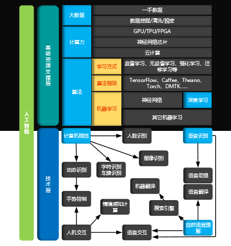 1、 人工智能生態格局三層架構,包括基礎資源支持層,AI技術層和AI應用層。基礎資源支持層主要包括人工智能核心處理芯片和大數據,是支撐技術層的圖像識別、語音識別等人工智能算法的基石。核心處理芯片和大數據,成為支撐人工智能技術發展的關鍵要素。AI技術層通過不同類型的算法建立模型,形成有效的可供應用的AI技術。AI應用層,則是利用中層輸出的AI技術為用戶提供智能化的產品和服務。